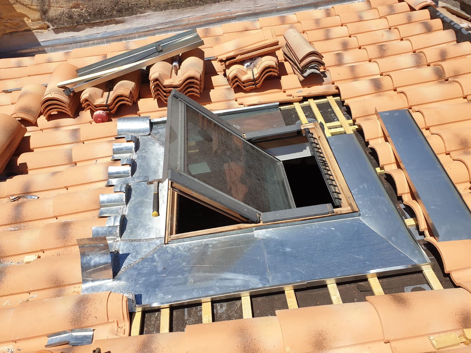 Les éléments d'étanchéité (abergements, solins, bavettes) sont soigneusement mis en place afin de garantir une protection optimale contre les infiltrations d'eau. Les tuiles mécaniques sont ensuite reposées avec précision pour une finition propre et durable. Cette installation permet d'apporter lumière naturelle, ventilation et confort à l'intérieur du logement.